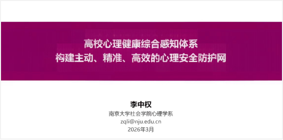 本次公益课以“心理护航”为主题,线上直播开展。讲座聚焦三大重点:一是回应“时代之问”,直面大数据背景下学生心理困扰隐蔽化的问题,探讨传统心理工作模式的升级路径;二是深耕“重构之路”,破解高校心理干预短板,分享如何打破“单点干预”局限,实现从“被动响应”到“综合感知”、从“分散管理”到“高效协同”的跨越;三是搭建“对话之声”,结合学术研究与一线经验,为构建精准高效的心理安全防护网提供借鉴。