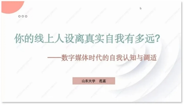 3月7日的课程《你的线上人设离真实自我有多远?——数字媒体时代的自我认知与调适》由山东大学范蕊老师主讲。范老师围绕你在扮演谁、你到底是谁、在虚拟与现实之间找到平衡三个方面,从数字媒体时代的自我认知、自我认知与调适、心理健康的重要性等方面和同学们进行了详细的探讨。本次课程氛围轻松、贴近学生,特别是对线上人设与真实自我反差极大弊病的剖析,引发了同学们如何平衡双面人生的思考,有利于促进我们更好的适应数字媒体时代的生活,护航自我成长与心理健康。